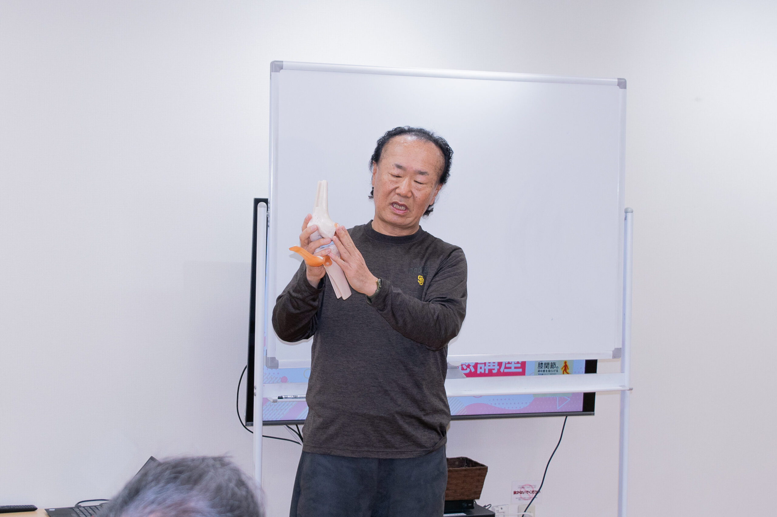 関節の模型や図を用いて、ひざ関節の痛みが発生しているときに内部でどんなことが起こっているのか、詳しく学びました♪