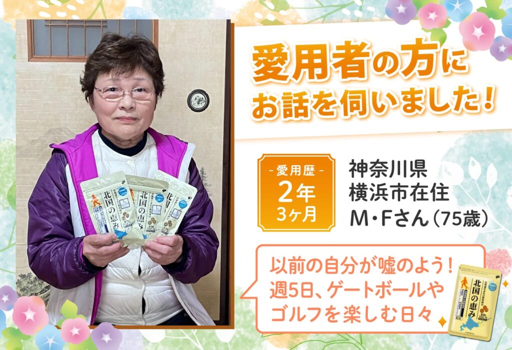 そんなとき、たまたまテレビCMで『北国の恵み』を知りました。「非変性プロテオグリカン」という聞き慣れない成分に興味を持ってお電話したら、オペレーターの方が丁寧に説明してくださって。これは良さそうだなと思い、注文しました。最初は1日3粒でしたが、すごく無理をしてしまった日があり、飲む量を増やしてみたところ調子が良くなって。それ以来、朝夕3粒ずつ飲んでいます。