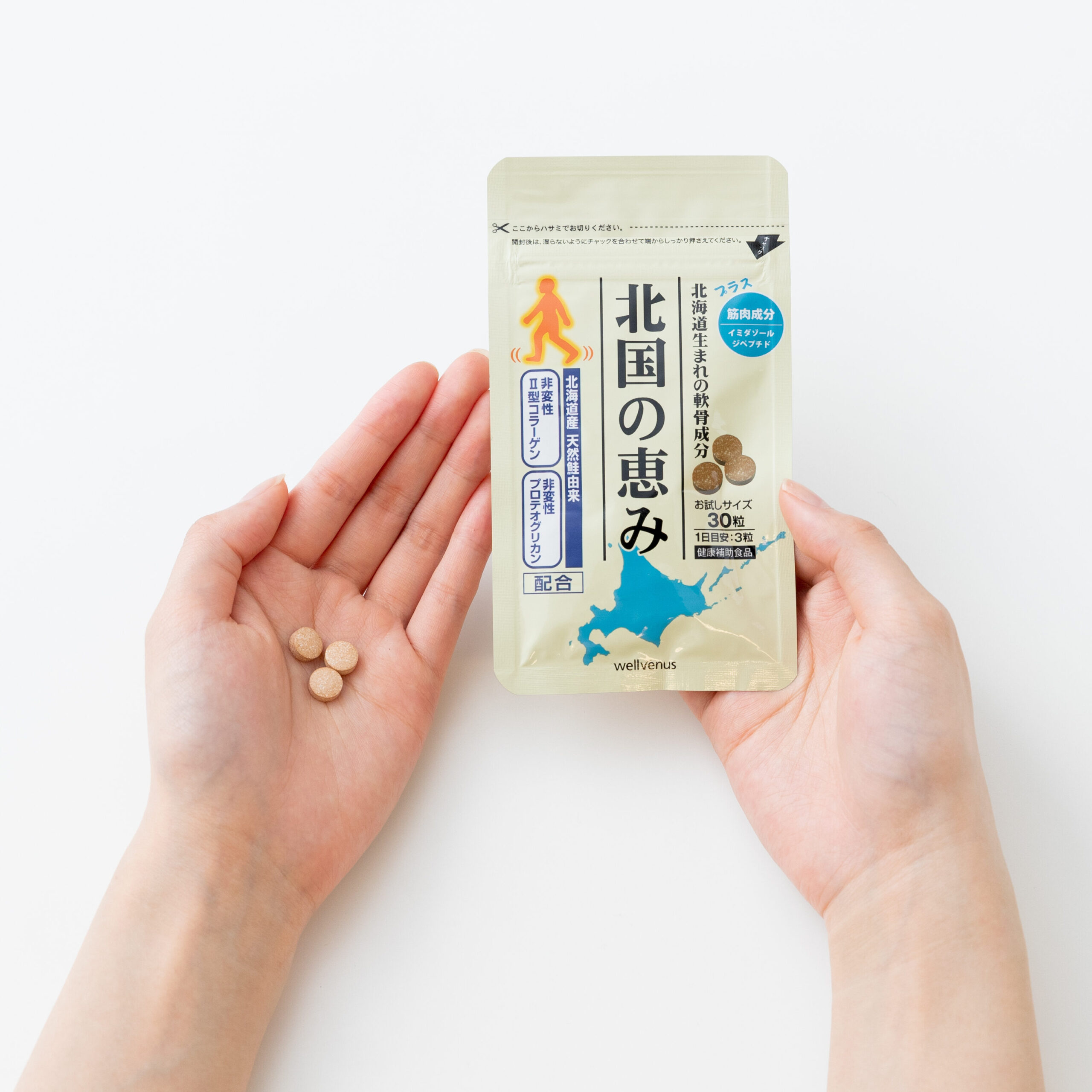 やっぱり根本的に解決しないとダメなのかなと思い始めたときに、たまたまネットで『北国の恵み』を見かけて。鮭の鼻軟骨なんて、ふだんの食事でたくさん食べられるものではないし、サプリで摂ったほうがいいのかなと、飲み始めました。