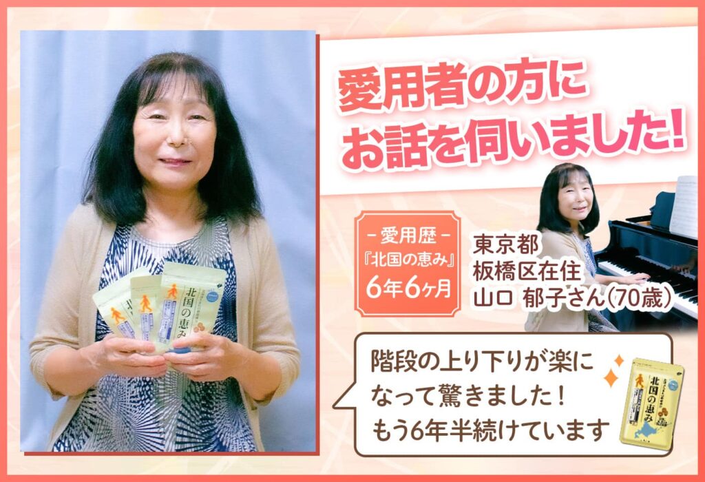 なんとかしたいと、ネットでサプリメントを探して、『北国の恵み』を見つけたんです。天然のサケの鼻軟骨が原料だということで、安全なんだろうなと思って注文しました。