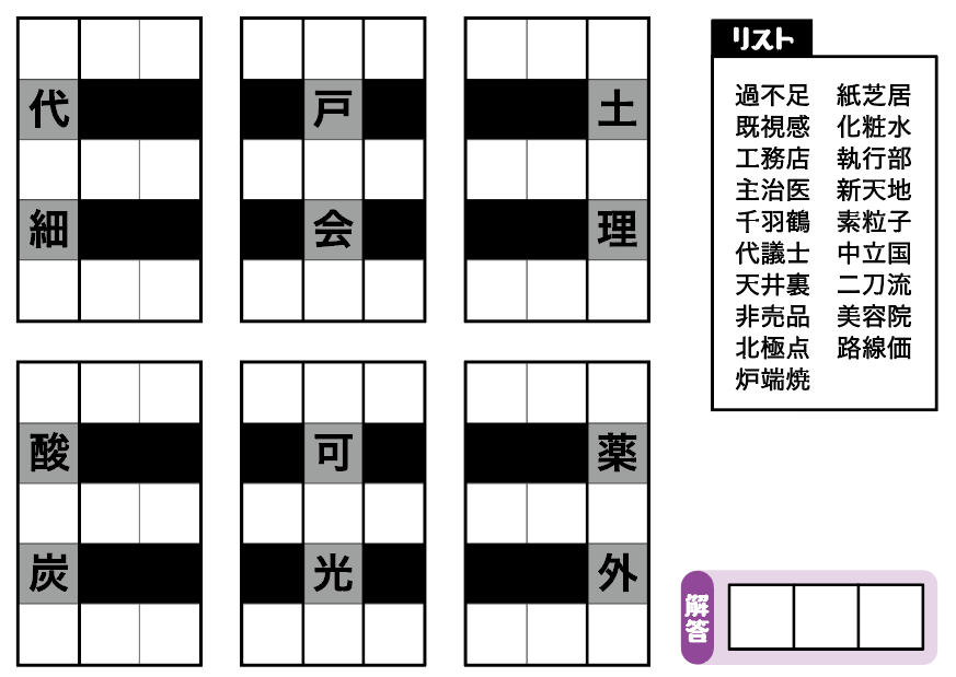 マスのヨコにリストの三文字熟語を入れていきます。その際タテに五文字熟語ができるようにして下さい。最後に、リストに1つ残る三文字熟語を答えて下さい。