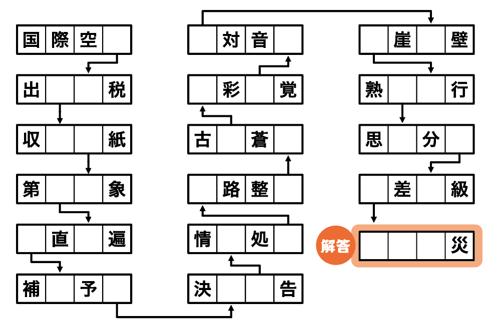 空きマスを埋めて四字熟語を完成させてください。矢印でつながったマスには同じ漢字が入ります。最後にできる四字熟語を答えてください。