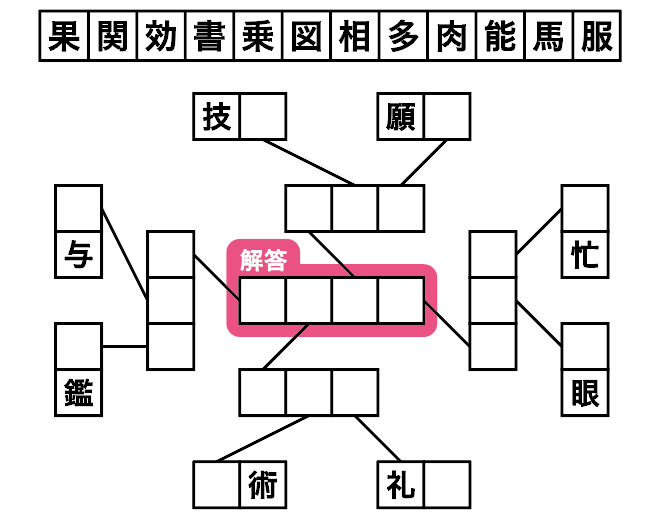 下のリストから漢字を選んでマス目を埋めてください。線でつながったマスには同じ漢字が入ります。最後にできる四字熟語を答えてください。