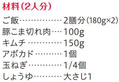 アポカドに含まれる「TGF‐β」という成分は、軟骨の土台となる繊維の生成を助け、すり減った軟骨を修復する作用が期待されています。豚キムチに加えて、満足感のある丼に。